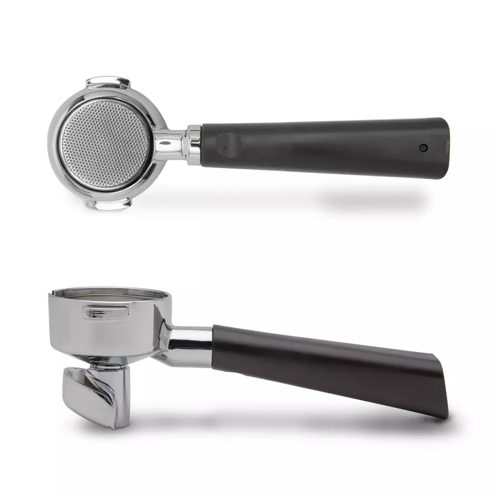 Portafiltro 2 vie con manico di design marrone studiato per agevolare la pressatura. Beccuccio Coffee Slide progettato per evitare il contatto con il piano di lavoro. Inclusi filtri 1 dose (9-11 g), 2 dosi (14-18 g), 2 dosi (18-21 g) e cieco in acciaio inox, collaborazione con IMS.