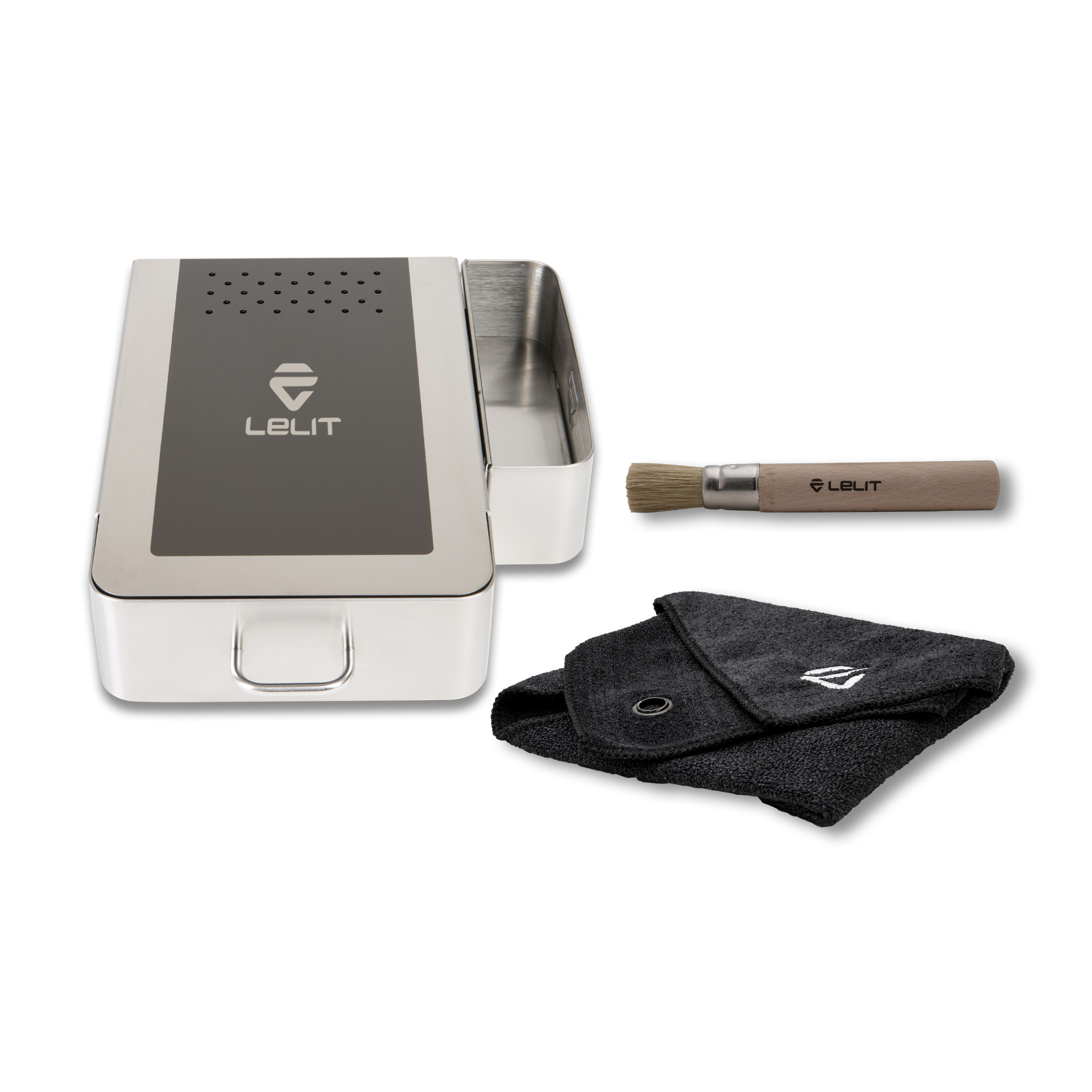 Knock box drawer with an innovative design made of brushed stainless steel, with holes to prevent condensation. The shaped inner drawer is dishwasher safe and the solid knocking rod is covered with rubber to better absorb impacts. The feet are made of stain-resistant and anti-slip rubber to protect the worktop from scratches. Equipped with a magnetic external storage compartment to be anchored to the side or to the back. It has a maximum capacity of 70 coffee grounds of 14 g each. It includes a microfiber cloth and a wooden brush with natural bristles. It can be used as a base for all LELIT coffee grinders.